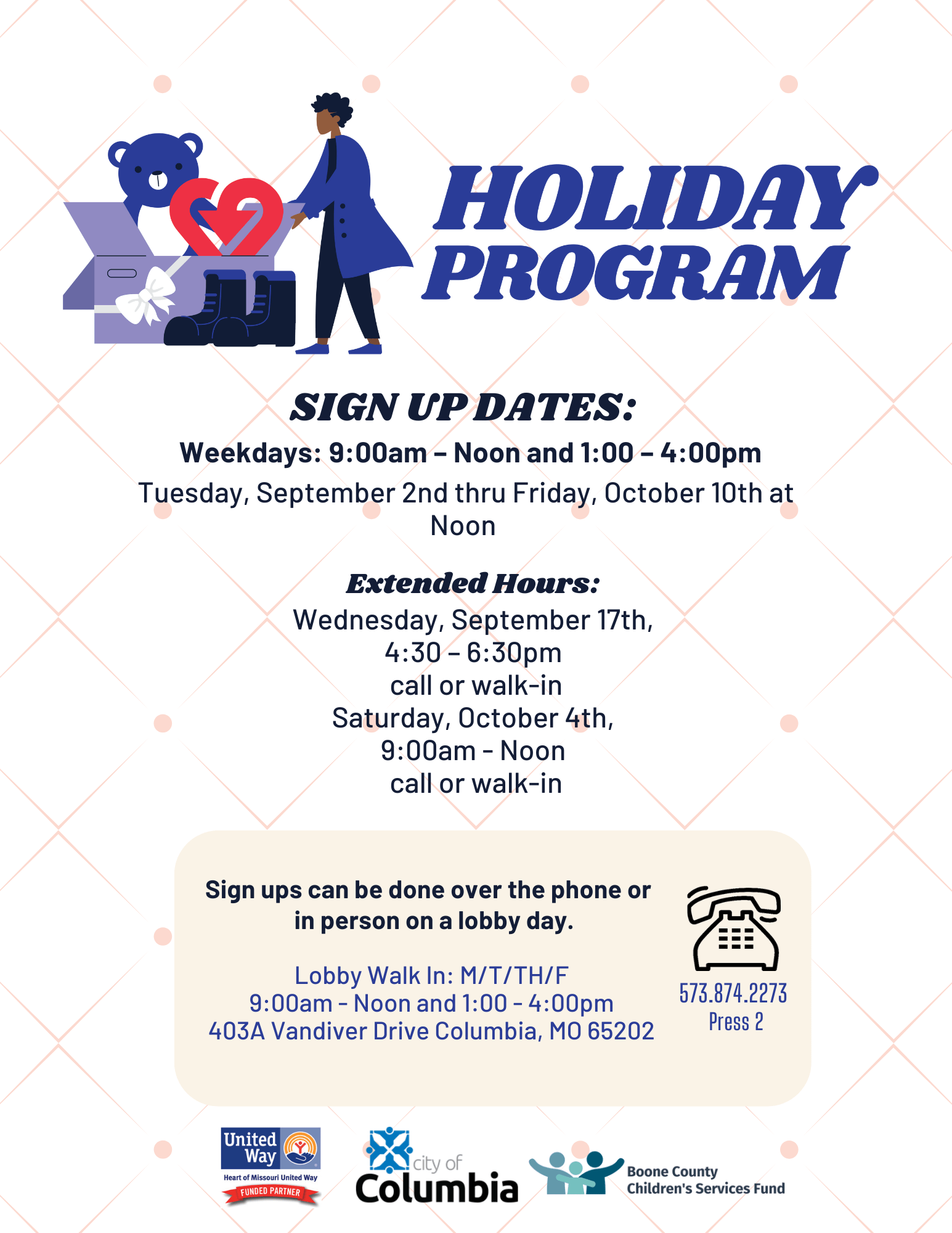 Children may only be signed up ONCE for the Holiday Program. If more than one person tries to sign up the child, it may DISQUALIFY the family.